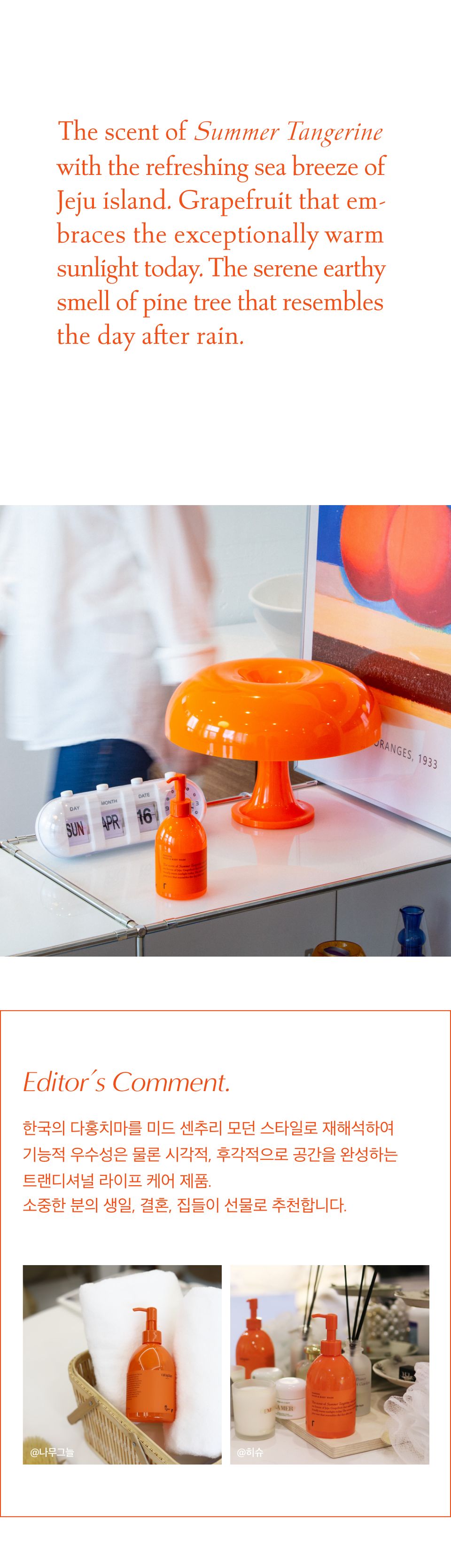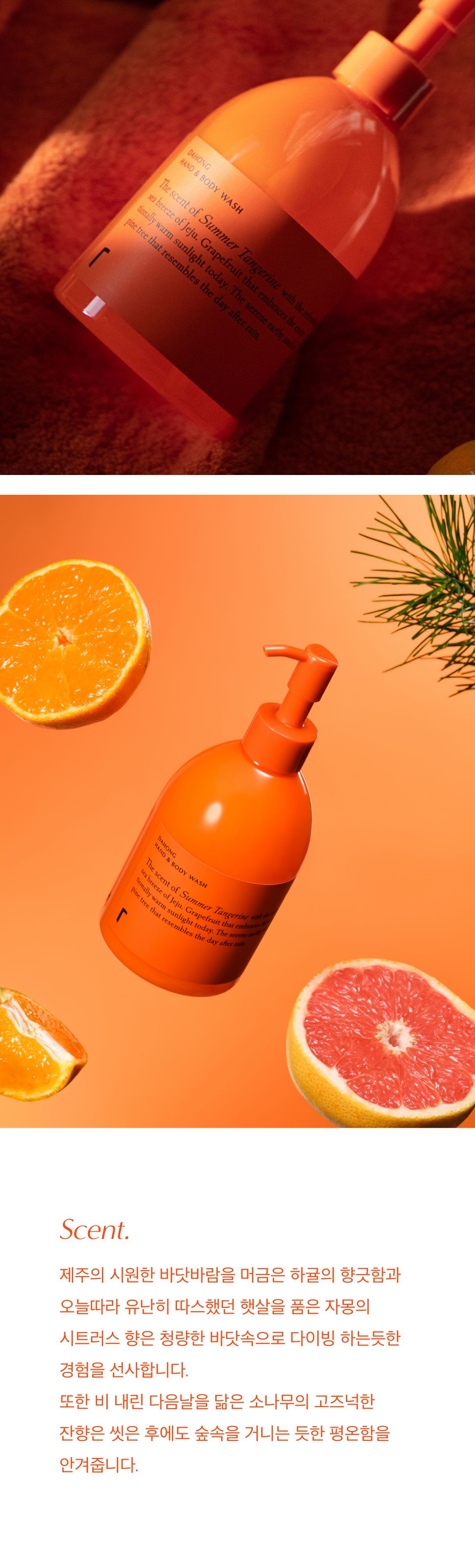 제주의 시원한 바닷바람을 머금은 하귤의 향긋함과 오늘따라 유난히 따스했던 햇살을 품은 자몽의 시트러스 향은 청량한 바닷속으로 다이빙 하는듯한 경험을 선사합니다. 또한 비 내린 다음날을 닮은 소나무의 고즈넉한 잔향은 씻은 후에도 숲속을 거니는 듯한 평온함을 안겨줍니다.