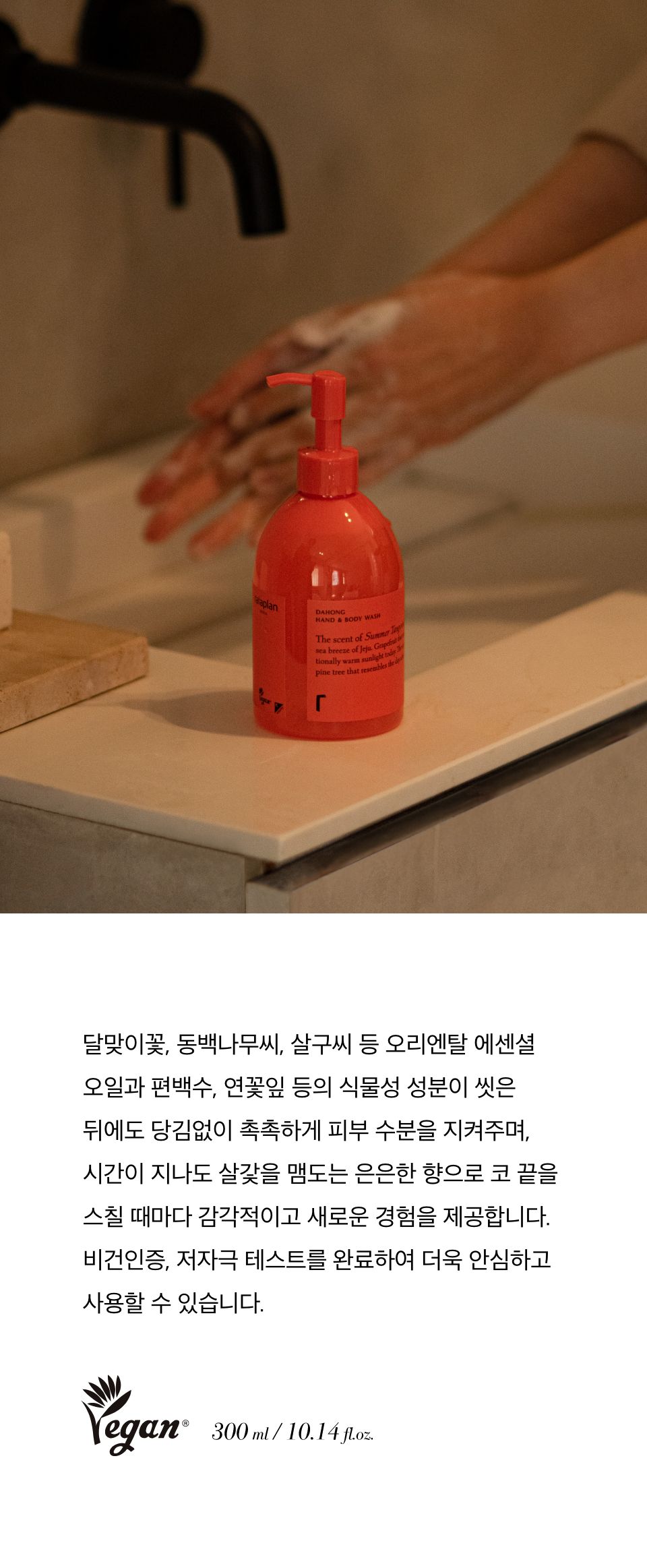 오리엔탈 에센셜 오일이 함유되어 당김없이 촉촉하게 피부 보습을 지켜주는 비건 핸드&바디워시