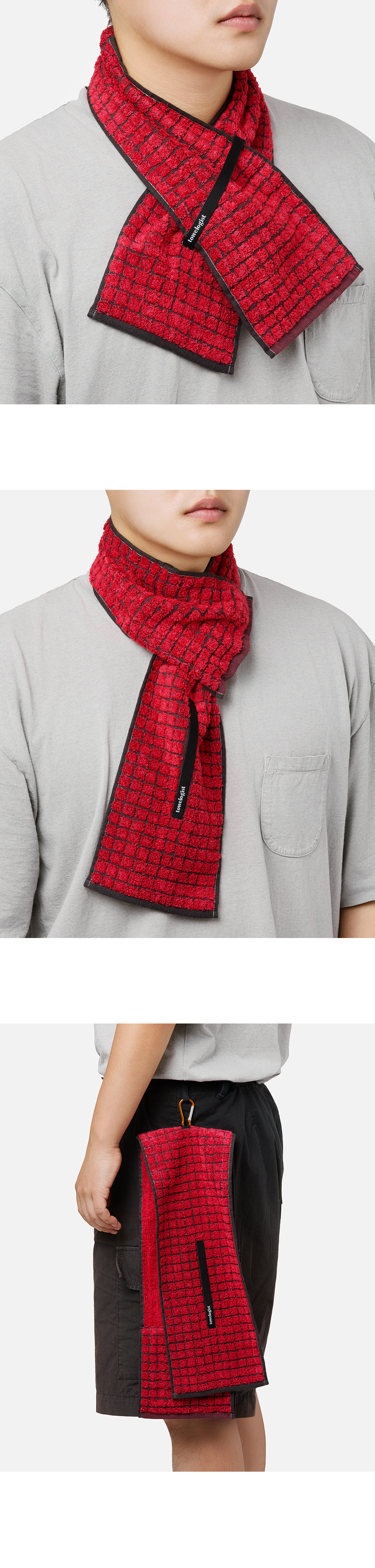 스타일링과 실용성도 고려했습니다. 가벼운 산책이나 조깅에는 하단 라벨을 이용해 목에 걸 수 있고, 격한 움직임이 필요한 상황에서는 하단 타월 고리를 활용해 단단히 고정할 수 있습니다. 또한 중앙에 위치한 고리는 바지나 가방에 걸 수 있어 휴대성과 활용도를 모두 높여줍니다.